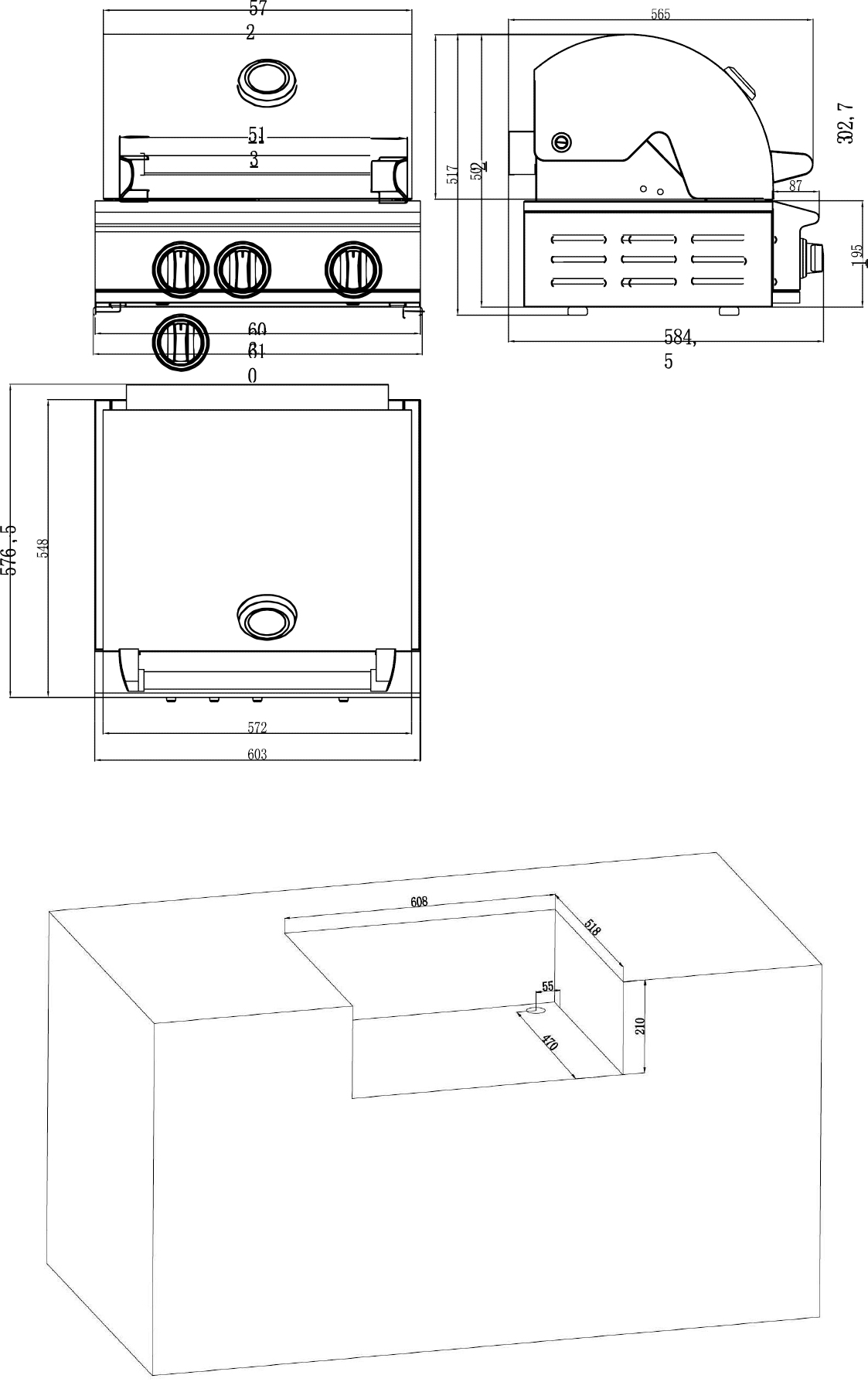 Quemador: Tubo de acero inoxidable 304#, T=1,2 mm / Panel de control: Acero inoxidable 304# / Indicador de temperatura / Superficie de cocción: 540 x 420 mm / Rejilla de calentamiento y parrilla de cocción de alambre de acero inoxidable 304# Ø5 / 4 Perillas en aleación de zinc / 1 Infrarrojos: 7000 but / 3 Quemadores : 10000 but